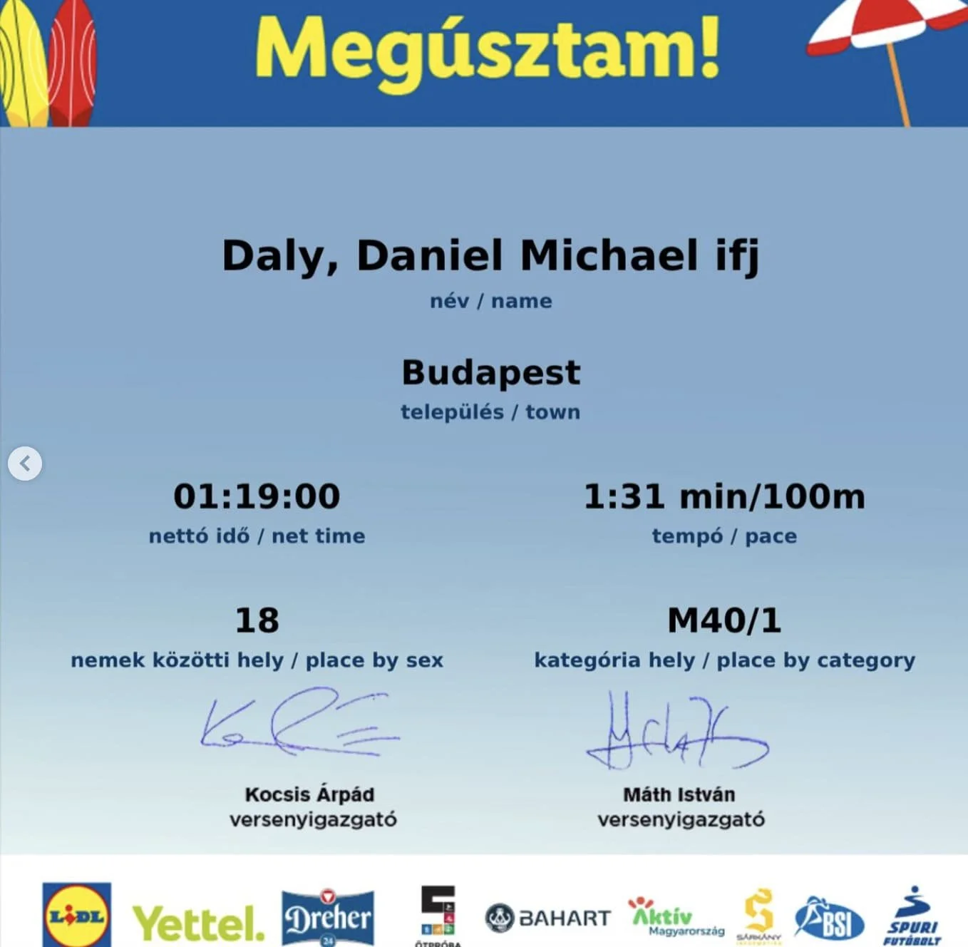 This year marked my fifth consecutive Balaton swim, and I was fortunate to celebrate my fifth straight age group win. Out of more than 10,000 swimmers, I placed 18th overall, crossing the 5.2 km course in 01:19:00 – averaging 1:31 per 100 meters. It was both humbling and satisfying to match my best time from five years ago, proving once again that consistency pays off.