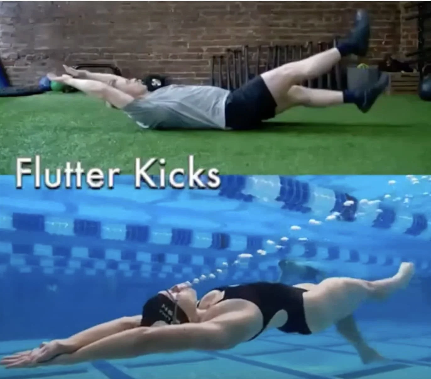 Outside the pool, you’ll also hear “flutter kick” used to describe a popular ab exercise – lying on your back, legs straight, alternating kicks above the ground. Different setting, same motion – and a great way to target your hip flexors, core, and lower abs.